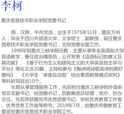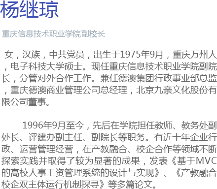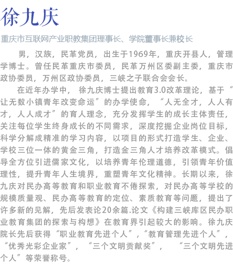 学校1995年创建以来,秉承“人无全才、人人有才、人人成才”的育人理念,为社会培养了三万多名技术技能型人才。学校现设有软件学院、汽车工程学院、电影艺术学院、经贸学院、康养学院、应用技术学院、继续教育学院、国际学院等8个二级学院,开设有电子信息、土木建筑、装备制造、财经工商、文化艺术、新闻传播、教育与体育、公共管理与服务、旅游、医药卫生等10大类的43个专业。其中软件技术为重庆市特色专业,计算机网络技术、计算机信息管理、商务英语等3个专业为重庆市教改试点专业。毕业生就业率连续多年在96%以上。目前,各类在校生逾万人。